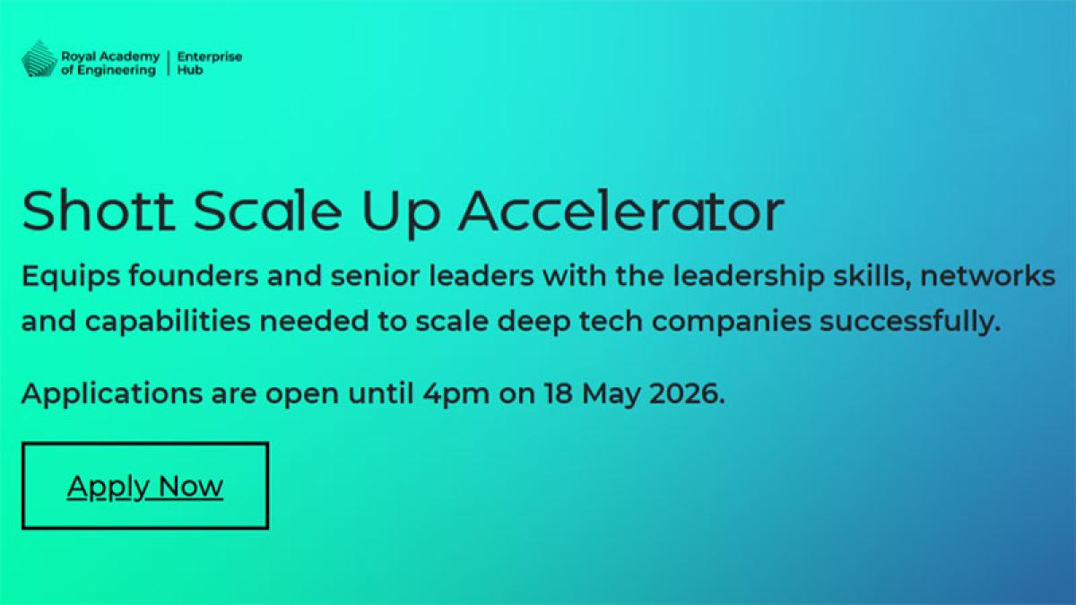 The Royal Academy of Engineering has opened applications for the Shott Scale Up Accelerator, a nine-month programme offering training, coaching and funding to ambitious small and medium-sized enterprises (SMEs).